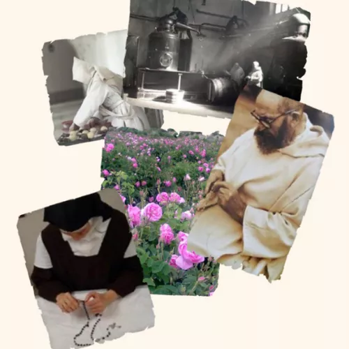 As rosas utilizadas, era justamente a Rosa Dinamarquesa, ou a Rosa de Alessandria. É uma espécie que tem a particularidade de ter muitas pétalas e acima de tudo, perfumadíssimas. A floração acontece uma vez ao ano. Essa espécie era abundante naquela época nos mosteiros. No seu tempo eles recolhiam as rosas e com uma técnica desconhecida por nós, eram produzidos os rosários. Somente 2 Monges guardavam zelosamente o segredo.